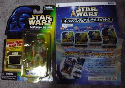 I'm still looking to put this figure into my collection, it's too bad I missed this find. He sold for $8.62US on November 20, 2008. It also came with a TOMY mail-in offer flyer. Apparently, if you send in five bar codes to the indicated Japanese address you will receive one of the figures shown in the flyer. The first three figure offers were for the Max Rebo Band 2-packs. The final figure offer was for a Freeze Frame Boba Fett. Only 1500 Boba Fett's were available, from June to September 2002.